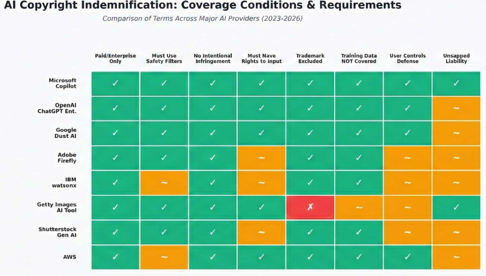 Vendor indemnification for AI-related IP claims has become a competitive differentiator. Microsoft, Adobe, and Anthropic offer enterprise indemnification under certain conditions. OpenAI offers limited indemnification for API, Team, and Enterprise customers. Midjourney offers none.