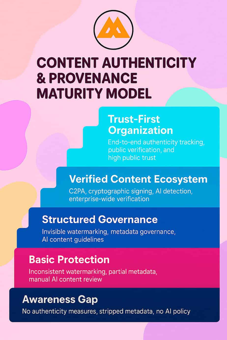 The questions above are not yes-or-no compliance checkboxes. They represent a spectrum of organizational capability. The Authenticity & Content Provenance Maturity Model provides a framework for assessing where your organization stands and where it needs to go.