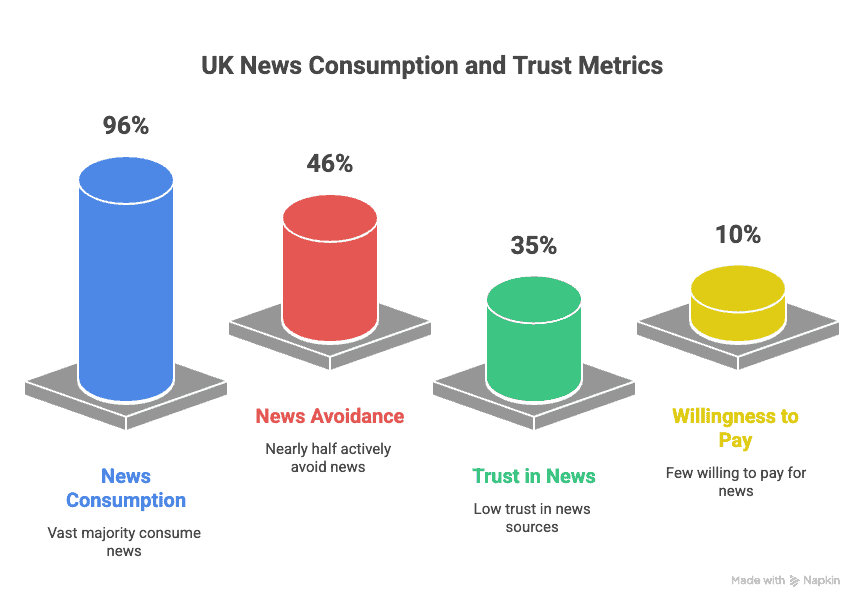 The metrics are damning: In the UK, 96% of adults consume news, yet 46% actively avoid it, trust has collapsed to 35%, and only 10% are willing to pay for it. The industry dug this grave by overproducing clickbait for ad pennies, eventually overwhelming the audience to the point of revulsion. With the advertising model now cornered by Google and Meta, publishers are desperate to sell subscriptions. But this strategy is doomed by a simple truth: you cannot charge people for the privilege of drowning in a content glut they already despise.